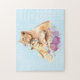 A puzzle with a cute watercolor painting of a mother lion holding her baby cub. A pretty purple floral bouquet below them, adds a gentle touch to this sweet and adorable image. Light blue background.