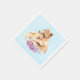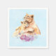 Paper napkins with a cute watercolor painting of a mother lion holding her baby cub. A pretty floral bouquet below them, adds a gentle touch to this sweet and adorable image. Light blue background.