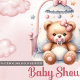 Wonderful design for girl Baby Shower invitations features Cute Watercolor pink teddy bear in crib with pacifier. Modern kidish Script typography.