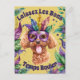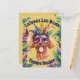 A watercolor poodle with a mask on its head in the colours of the Mardi Gras festival, green, yellow and purple is a great choice if you want a dog lover, a poodle to send a card during the Mardi Gras holiday. This card is filled with floral arrangements in the colours of the festival and reads Laissez Les Bons Temps Rouler which means Let the god times roll.