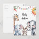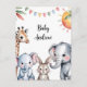 A delightful, high-quality watercolor illustration featuring a group of adorable baby safari and jungle animals. The main subjects include a sweet-faced giraffe, two chubby baby elephants with pink inner ears, and a cute bunny rabbit, all rendered in a soft, gentle art style ideal for children. The top of the frame is decorated with festive, colorful bunting flags and watercolor tropical leaves in soft green, pink, and orange tones.