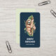 A vertical business card with a cute watercolor design featuring a cute sloth hanging onto a tree branch surrounded by green tropical leaves. Dark blue background on the front and light olive green background on the back.