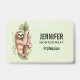 Name badge with a cute watercolor design featuring a cute sloth hanging onto a tree branch surrounded by green tropical leaves.