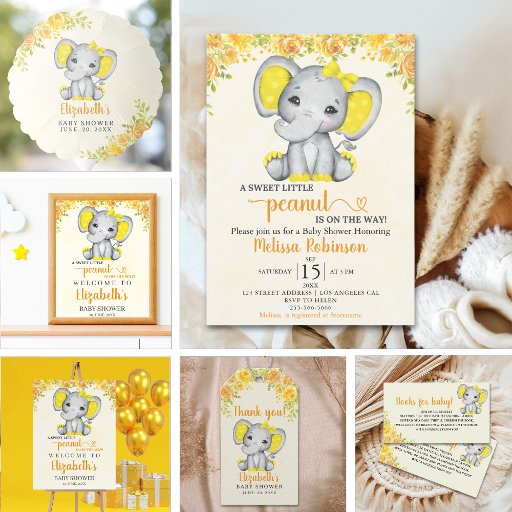 A charming design for your baby shower! Our design features a beautiful hand-painted watercolor elephant in yellow, with pretty orange and black font and the phrase "A Sweet Peanut is on the Way." Perfect for welcoming that sweet baby girl! Personalize your baby shower design by adding your event details.