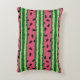 A pillow with a cute watermelon pattern. Green rind in layers of stripes along with a layer of pink stripes with black seeds inside.