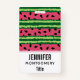 A name tag with a cute watermelon pattern. Green rind in layers of stripes along with a layer of pink stripes with black seeds inside.