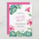 This cute wedding invitation features your names set in a stylish handwritten script typography with event details in a classic charcoal grey serif font on a crisp white background surrounded by a boarder of my original watercolor pink hibiscus flowers and monstera palm leaves in shades of blues, greens and turquoise. The invite card reverses to a complimentary tropical vibrant pink colour. A botanical yet elegant choice for casual luau beach wedding in Hawaii. To see more from this pink hibiscus flower wedding theme visit https://www.zazzle.com/collections/pink_hibiscus_flower-119064582807479077