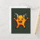 Cute devil postcard with an ink drawing of a yellow weird demon creature with horns smiling happily and showing its sharp teeth.