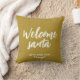 Cute Christmas holiday accent throw pillow with a personal message to "Welcome Santa". Cute jovial modern holiday welcome to the big guy over a rich gold cloth texture print. Great addition to any holiday home decor - warm, cosy Christmas gold pillow with milky white script letters in minimalist typography. Happy Holidays!