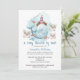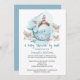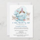 A cute boy baby shower by mail invitation with a message to request cards and gifts by mail, with envelopes and a whale illustration in pastel blue and white colours. Personalise it to celebrate the mum-to-be by adding your party details, the organiser's name, and registry information.