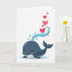 This design shows a round, deep-ocean blue whale centered on a bright white background, its smooth cartoon shape standing out clearly. The whale’s glossy black eyes, rosy cheeks, and small upturned smile give it a sweet, friendly look that feels a lot like a quiet crush 🥰. From the blowhole, a light blue stream arcs upward like a fountain, as if it’s sending a gentle message into the air. Floating in and above that stream are several red hearts in different sizes ❤️, rising toward the top of the card like little love notes. Tiny droplets in soft pink and teal scatter around the hearts, adding light touches of color without crowding the scene. There’s no written text anywhere, leaving open space above and around the whale so the hearts and water arc become the main “message.” The highest hearts cluster near the upper edge while the pale blue spray curves diagonally, with a few droplets trailing off to the sides.
