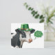 St. Patrick's Day postcard featuring a cute, festive watercolor illustration of a black and white cow ready for a St. Patrick's Day celebration weaing a green top hat with a gold band, white daisy and green shamrock. Text "Where the Craic?" in a green thought bubble (craic translation = good time). A watercolor shamrock in lower left corner on the reverse.