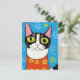 A simple whimsical illustration of a cute black and white cat portrait wearing a red spotted jumper.