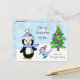 Cute Whimsical Christmas Penguin and Bird eating bird seed with Christmas tree and snowflakes in the background personalised postcard Christmas card,