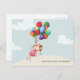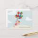 She is leaving and you can't stop her because she has to follow her own path. With this cute postcard you won't be writing a few words with good wishes, you will be giving her your heart on a unique piece of art that she will cherish forever. The illustration shows a girl in a pink dress floating away while holding a bunch of bright balloons in red, blue, purple green and yellow colours . Where is she going? Only you know. But she is enjoying the trip while she is crossing her ankles and flying away. The soft background colours make the image pop and be the centre of attention. The light blue sky has big white clouds. The soft brown floor has the sentiment that reads "good luck in your new adventure". This text can be personalised and even customise further by changing the font, its colour and size.