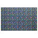 Fabric with a pattern of hand-drawn whimsical birds. Cute little green pine trees between them. Dark blue background.
