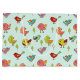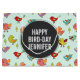 Birthday gift bag, large sized. Designed with a pattern of hand-drawn whimsical birds. Cute little green pine trees between them. A black circle layered over top, on the front, with your personalised text inside.