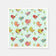 Paper napkins with a pattern of hand-drawn whimsical birds. Cute little green pine trees between them. Mint green background.