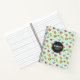 A notebook with a pattern of hand-drawn whimsical birds. Cute little green pine trees between them. A black circle layered over top wuth your name and tite/subject inside.