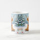 This cute Christmas seasonal coffee mug that has an ai watercolor style illustration of a baby Highland Cow sitting in a whimsical snowy field during a winter day with a backdrop of holiday decorated pine trees.