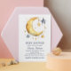 Cute whimsical watercolor yellow moon and stars Invitation for celestial space baby shower with blue navy back side.
