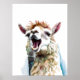 Cute white alpaca singing through microphone poster