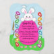 A very cute Easter Egg Hunt Invite featuring an adorable white rabbit, peeking out over a giant pink Easter egg. The egg is framed by smaller Easter eggs and there is a trail of bunny paw prints along the bottom. All text details can be customized to suit. The back features a cute sign post saying, "Bunny Crossing" and there is a small bunny peering out of a rabbit hole on the grass below, with more Easter eggs nearby.