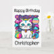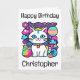 A cute custom birthday card featuring a cute, whimsical, white cartoon kitty cat with big blue eyes, pink ears and wearing a bright colourful collar. She has a cute blue, pink and white striped tail and a blue stripe on her head. The background is mostly purple with planets, clouds, stars and flowers in a mix of bold, bright, vibrant colours. Ideal for anyone who loves cats and space. Templates on the front and inside enable you to add your own text to personalise.