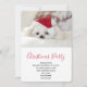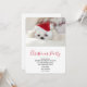 Christmas party invitation with an adorable photo of a cute white doggy wearing a red christmas hat.