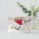 Thank you postcard with an adorable photo of a cute white doggy wearing a red christmas hat.