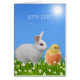 Cute white Easter bunny with chick and flowers on sunny sky blue Card. Text can be personalised for Easter or Birthday. Bunnies symbolise longevity, abundance and good fortune.