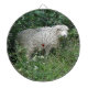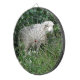 This awesome dartboard features a photograph of a cute fluffy sheep. The sheep is surrounded by wild flowers and long grass and is eating some leaves. It has a thick white coat of wool and a cute black nose.