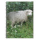 This awesome notebook features a photograph of a cute fluffy sheep. The sheep is surrounded by wild flowers and long grass and is eating some leaves. It has a thick white coat of wool and a cute black nose.