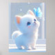 An adorable fluffy white kitten with big, sparkling blue eyes is gazing up at a delicate blue butterfly resting on its nose. The mix of the kitten's innocence and the butterfly's beauty brings out a feeling of wonder and calm.