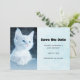 Save the date card with an adorable photograph of a white short-haired kitten with bright blue eyes. Staring off into the distance. Paws crossed in typical kitty cat fashion.
