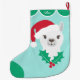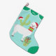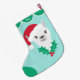 An adorable white llama wears a red Santa hat on the front of this personalised Christmas stocking. Behind him another Santa hat hangs on a green cactus. At his feet is a brightly wrapped gift package. The top of the stocking has a teal green scalloped border with your custom text in white. A matching toe patch design completes the front. The back of the stocking has the same light blue background, border and toe design, with another portrait of the llama. A cute southwestern design for the Holiday Season!