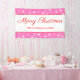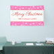 This Merry Christmas design has a pink and white snowflake pattern, with red font, and family name text for you to change.