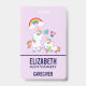 Name badge with a white mama unicorn with fancy colourful mane and tail. A baby unicorn laying down beside her, with a green pacifier in its mouth. A colourful rainbow with fluffy clouds, and some stars and heart decorate this sweet and adorable design. A bold pink outline surrounding the image gives it a child-like doodle vibe. Perfectly adorable for caregiver professions and related fields.