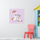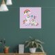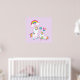 A poster with a white mama unicorn with fancy colourful mane and tail. A baby unicorn laying down beside her, with a green pacifier in its mouth. A colourful rainbow with fluffy clouds, and some stars and heart decorate this sweet and adorable design. A bold pink outline surrounding the image gives it a child-like doodle vibe. Light purple-pink pastel coloured background.