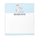 A notepad with a white mother unicorn with fancy colourful mane and tail. A baby unicorn laying down beside her, with a green pacifier in its mouth. A colourful rainbow with fluffy clouds, and some stars and heart decorate this sweet and adorable design. A bold pink outline surrounding the image gives it a child-like doodle vibe. Light blue border.