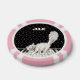 These poker chips have a black and white image of a cute white cat walking across piano keys with various white music notes in the background.