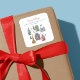 This cute charming illustration features original hand painted whimsical paintings of a winter village alpine ski lodge cosy chalet and children winter fun Christmas in nature with white snow mountain landscape scene, tiny houses, snowflakes, pine trees, and an icy pond with skating people on a blue ecru red background. Original Artwork by Caroline Bonne Müller