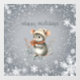 A cute grey mouse dressed for winter in a stocking cap and scarf holds berries and wishes you “Happy Holidays.” It is surrounded by a white snowflake design. The greeting can easily be changed to anything you prefer.