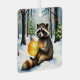 Sweet personalized Christmas ornament with a sweet watercolor raccoon holding a gold ornament sitting in a snowy forest.