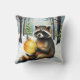 Sweet Christmas throw pillow with a sweet watercolor raccoon holding a gold ornament sitting in a snowy forest.