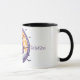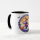 This customisable "Halloween" themed mug design features a cute witch flying on her broomstick with a text that you can personalise.