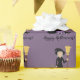 Destei's original cartoon illustration of a cute Halloween witch girl. The witch is holding a broom and she has a black cat by her feet. The witch has a black outfit and her socks are purple and grey striped. Her hair is long and grey in colour. There is also a big bowl with bubbling green liquid in it next to the witch. Under the image there is a personalizable text area that now reads "Happy Halloween!". The background colour is purple.