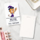Name badge with a cute witch wearing a big purple witches hat. Her black cat resting on top her head. She has long orange hair and is carrying a broom. Cute cartoon illustration perfect for halloween.