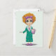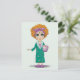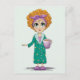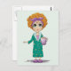 A cute woman in her nightgown holding a coffee mug. Sweet and funny girl illustration with big green eyes, redhead, and a green/teal/ aqua housecoat and purple slippers and ribbon.Fun The hair is a yellow/orange colour. Woman cartoon graphic. Digital art Illustration hand-drawn by Donna Leger. Part of my Beautiful Big eyes whimsical art drawing series.