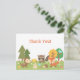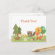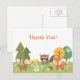 Express your thank you with this cute and colourful greeting postcard that comes with a variety of woodland furry animals which include a bird on the tree, a deer, a fox, a hopping bunny, a racoon, a squirrel with acorn nut and a hedgehog. Spring forest background with trees, white daisies, red flowers and polka dots mushrooms. Text reads "Thank You!"